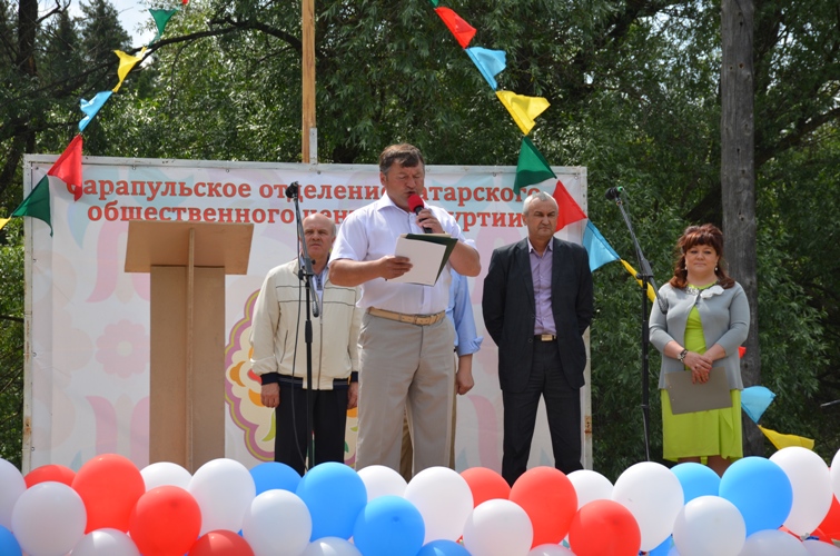 Ә кунакка безнең татар халкы буш кул белән генә йөрми, әлбәттә. Бу юлы да район башлыгы Валерий Макаров Сарапул татарларына, бәйрәм кунакларына Татарстан лидеры Рөстәм Миңнехановның милли бәйрәмебез белән котлавын җиткерде, Сабан туе бүләген – телевизор тапшырды. Ә районыбыз үзешчәннәре күчтәнәчкә дәртле җыр-биюләр алып барганнар иде.