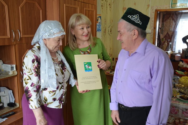 Әгерҗедә яшәүче, быел Алтын туйларын билгеләп үтүче Фәнзилә–Заһретдин Вәлиевларны ЗАГС бүлеге җитәкчесе Лилия Госманова өйләренә барып котлады. Ул аларга район башлыгы Валерий Макаровның котлавын һәм бүләген тапшырды, изге теләкләрен җиткерде.
