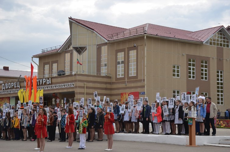 Әнә, сугышта катнашкан бабалары, якыннарының, тыл хезмәтчәннәренең, 250 укучы мәйданга керә. Һәр сурәт астына батыр якташларыбыз турында мәгълүмат язылган. Бу үсеп килүче буынның бабалары батырлыгын бүгенгәчә онытмавы турында сөйли. Күңелләрдә батыр якташларыбыз белән горурлану хисе туа.